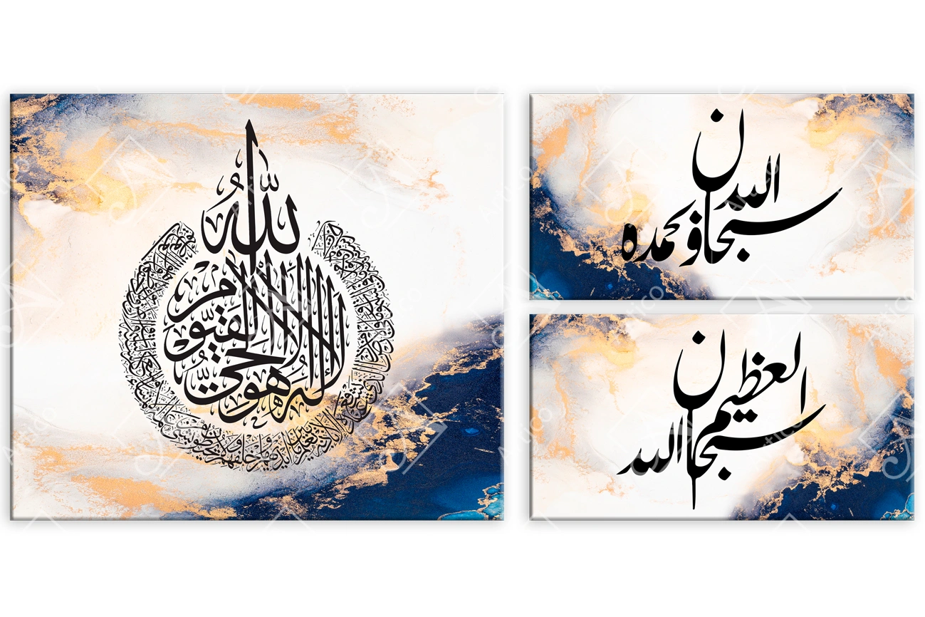 Islamic tableau 3 pieces Quranic verses on abstract blue marble background for interior decoration