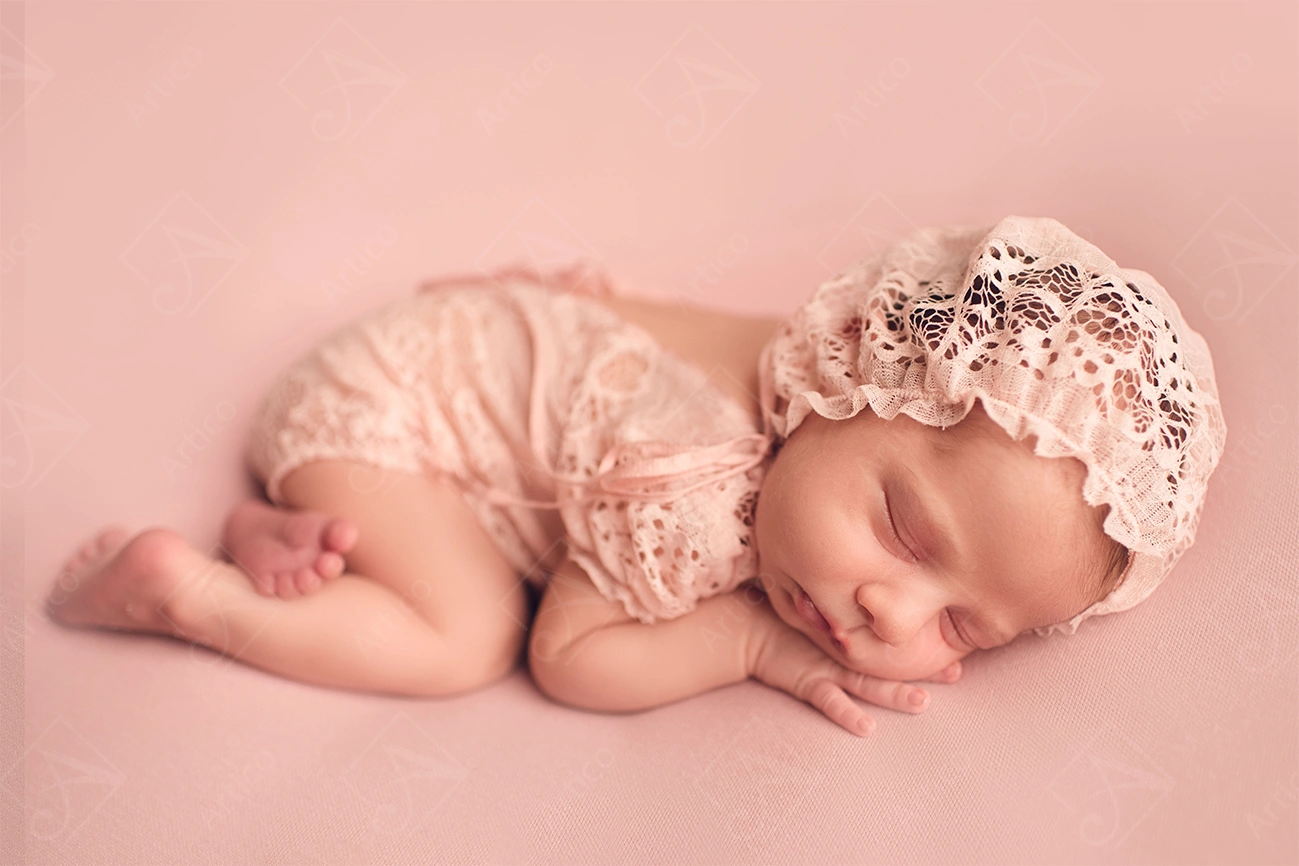 Cute newborn baby girl lying on her stomach in a lace dress.