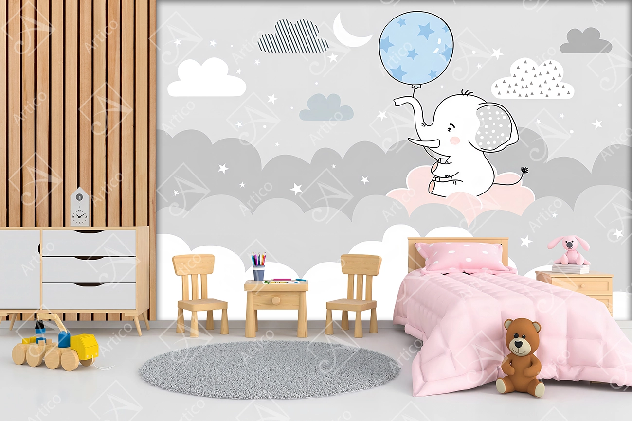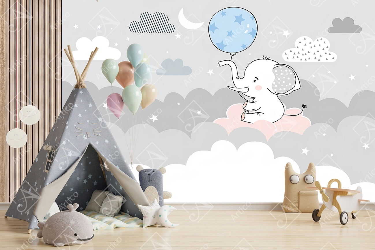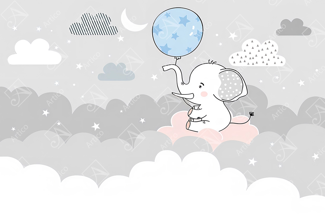 Wallpaper Cute Little Elephant Cartoon Sitting on The Clouds Playing Balloon For kids room.
