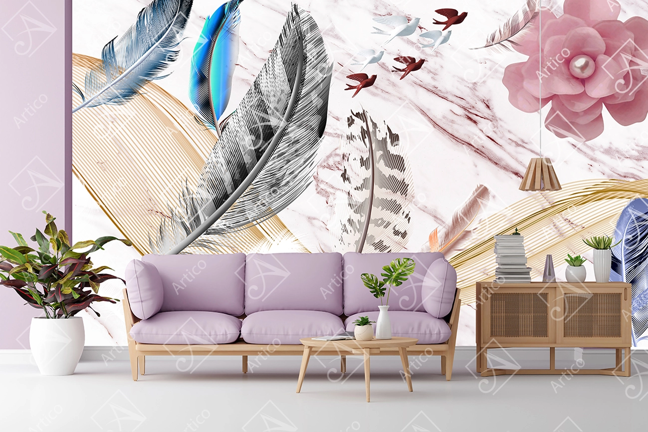 3D Wallpaper Feathers on Golden Wave Birds and Roses on Marble Background For Bedroom and Living Room.