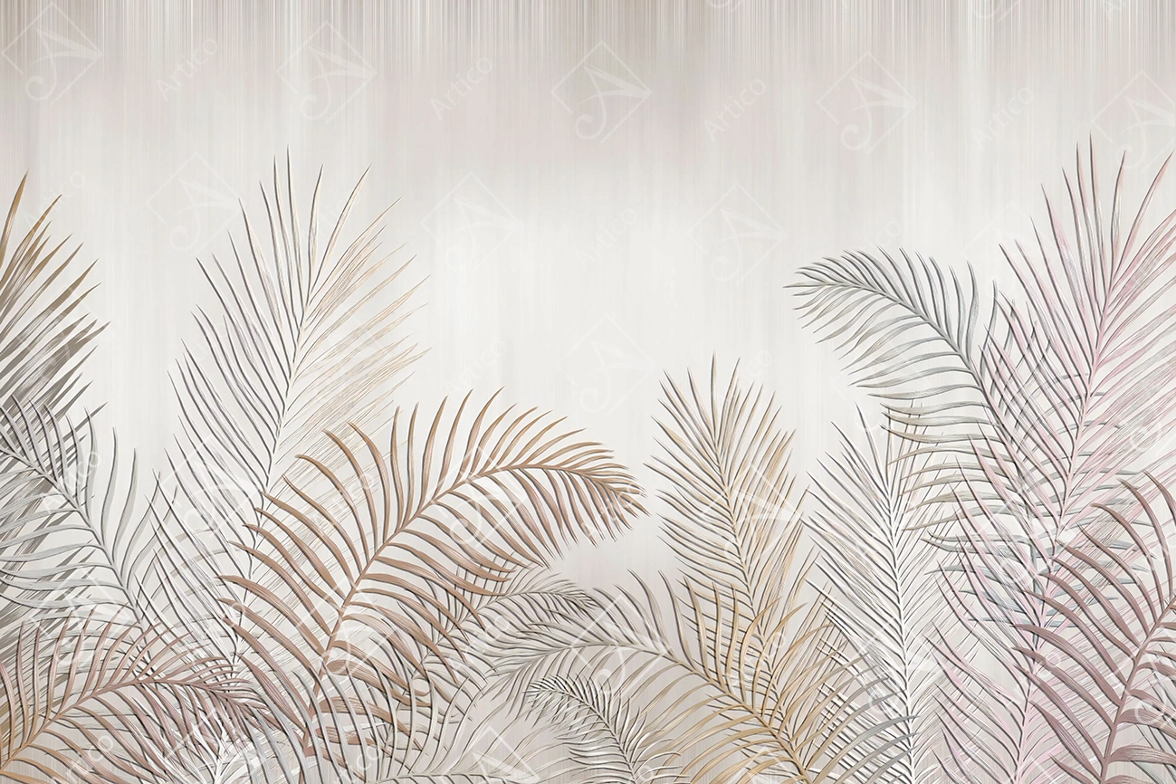 3D Tropical Palm Leaves Wallpaper Gradient Beige Background for Living Room.