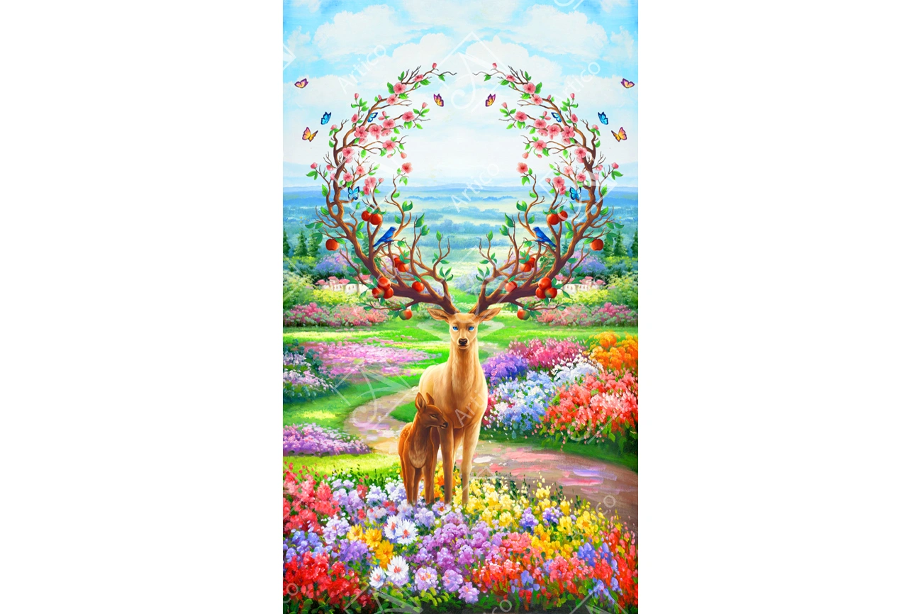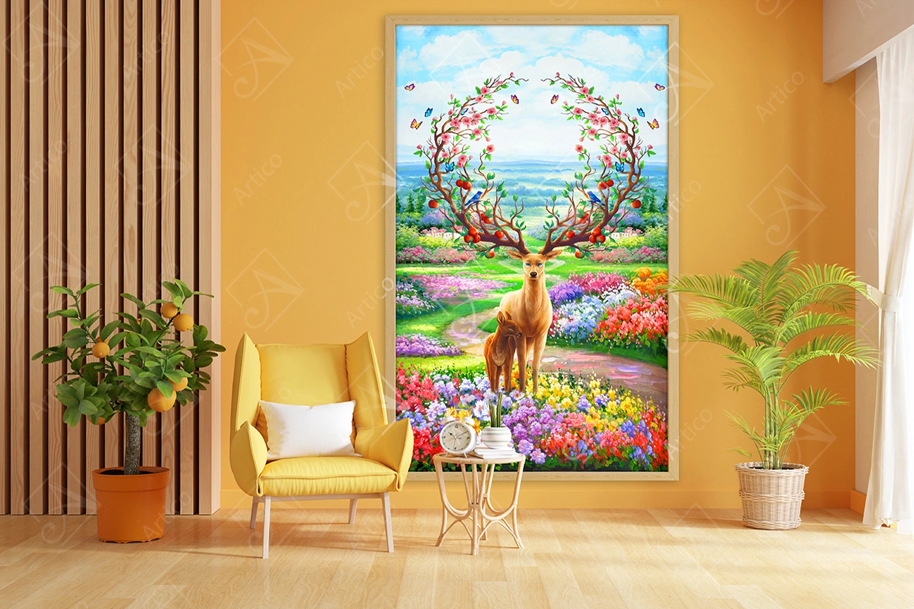 Two beautiful deer, antlers tree branches wall background with bed for home decor.
