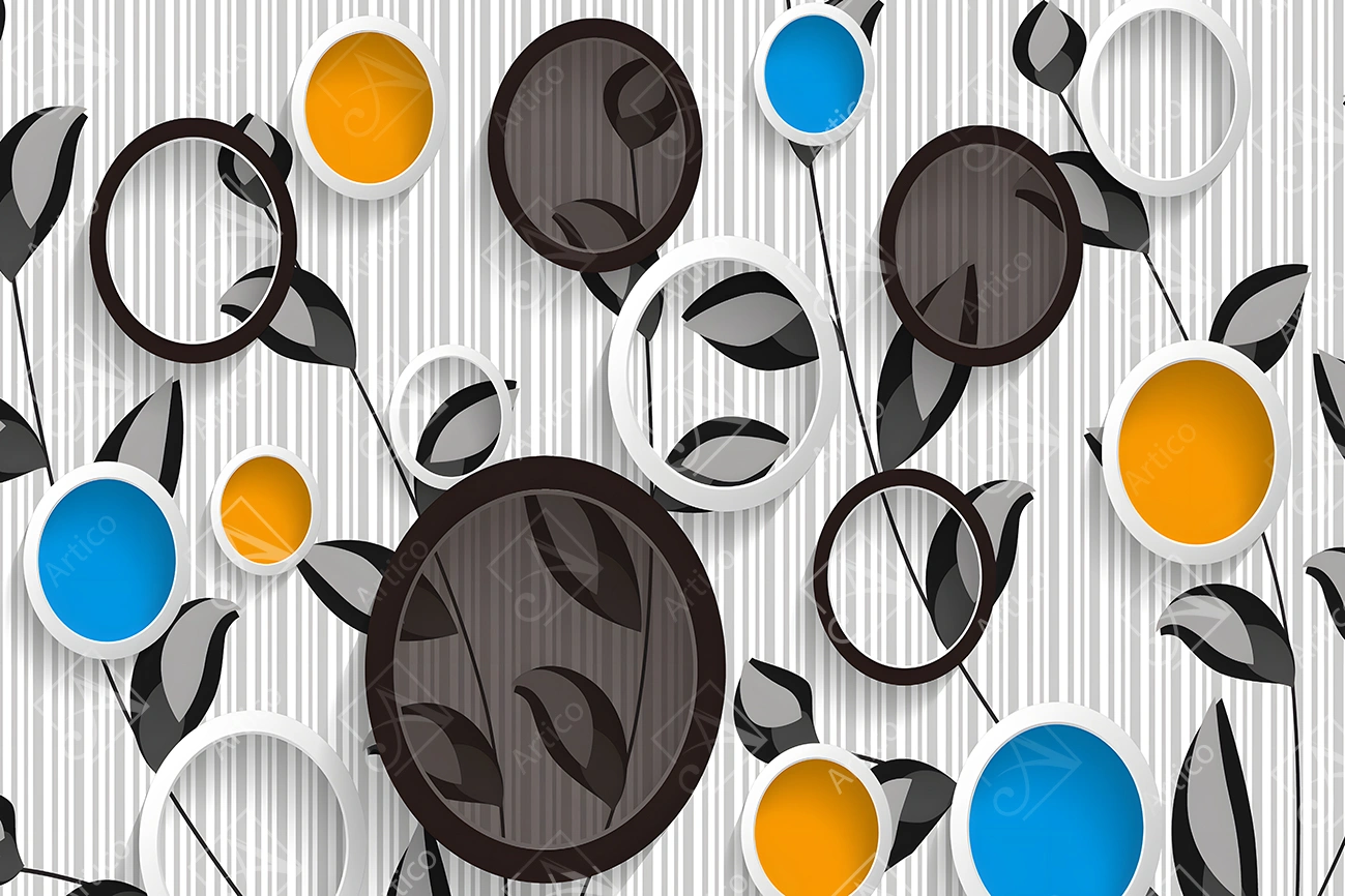 3D wallpaper colorful circles with black branches and leaves on a striped background for living room and TV