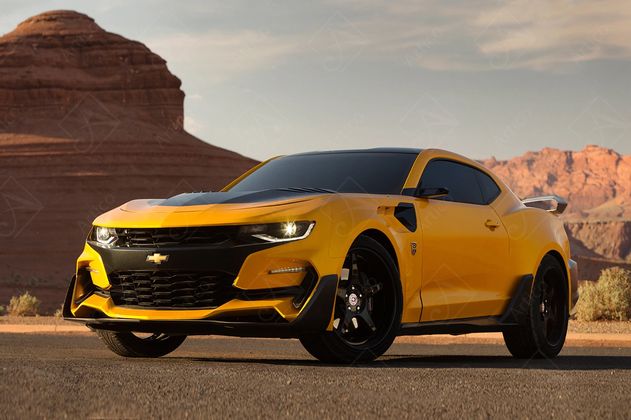 3D wallpaper of a yellow Chevrolet Camaro standing in the Nevada desert. Design for youth rooms.