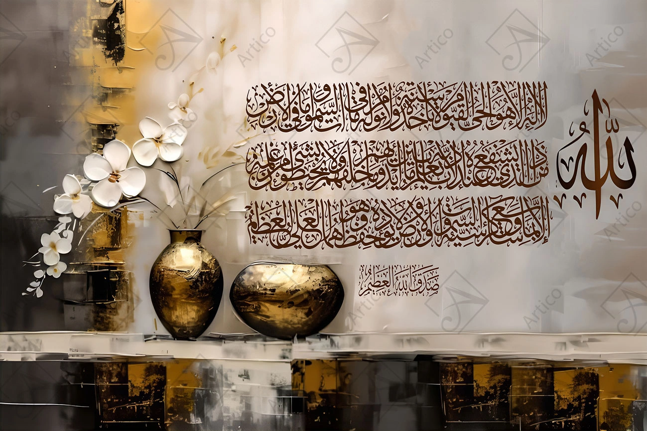 Hanging painting of a vase of white roses with a Quranic verse.