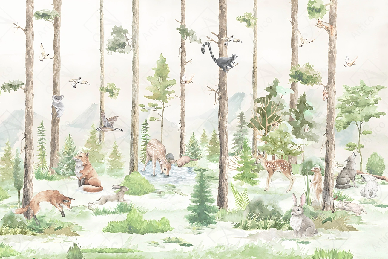 Green forest with many animals. Deer, fox, wolf. Scenic landscape. Wallpaper for children.