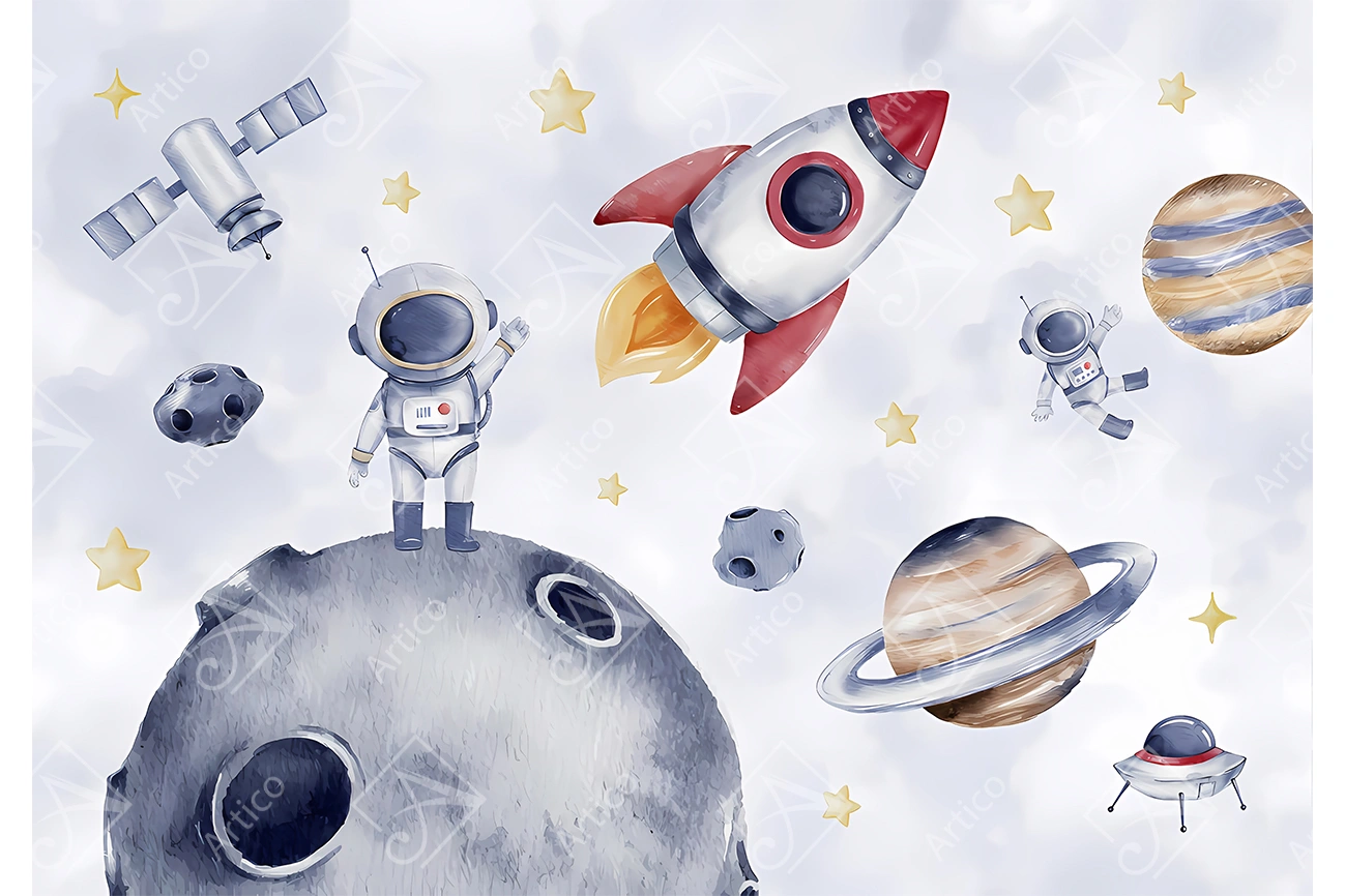 A starry sky, with the planets of the solar system, the constellations of the zodiac, a flying rocket and an astronaut, a scene from outer space.