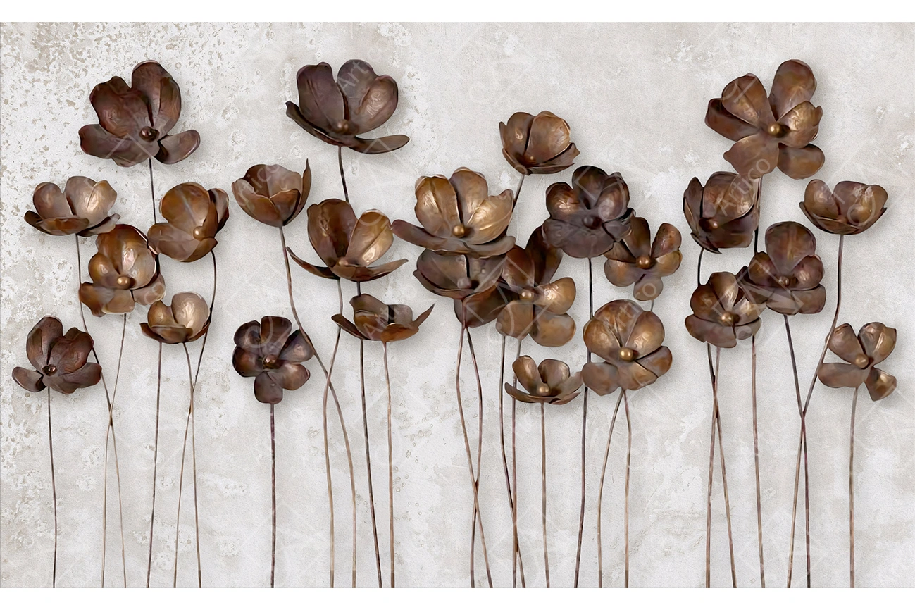 3D wallpaper featuring a collection of prominent brown flowers on an abstract gray background.