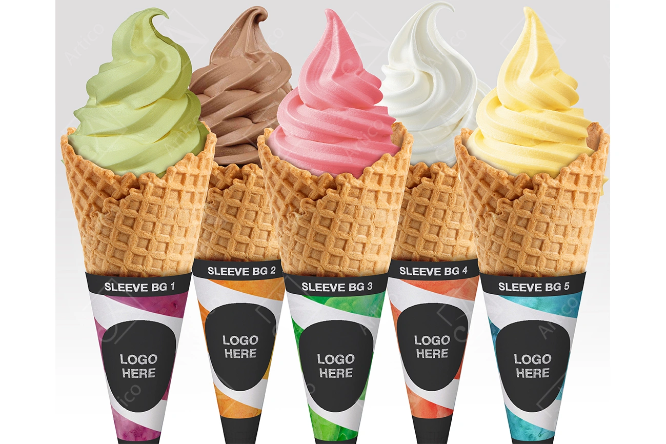 Mockup a collection of colorful and assorted ice creams in waffle cones on a gradient gray background.