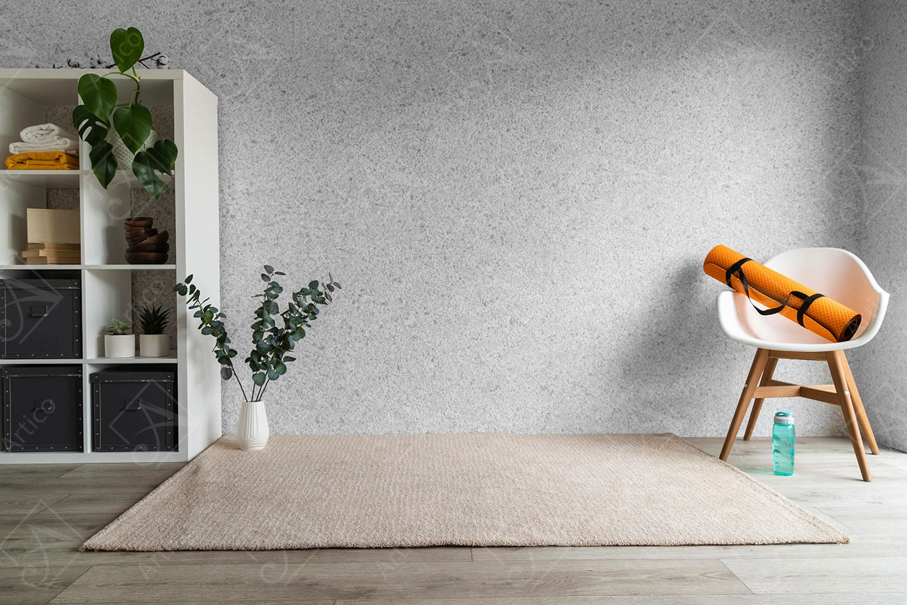 Interior design of a youth room with a gray concrete wall, a library, a chair and a plant vase.